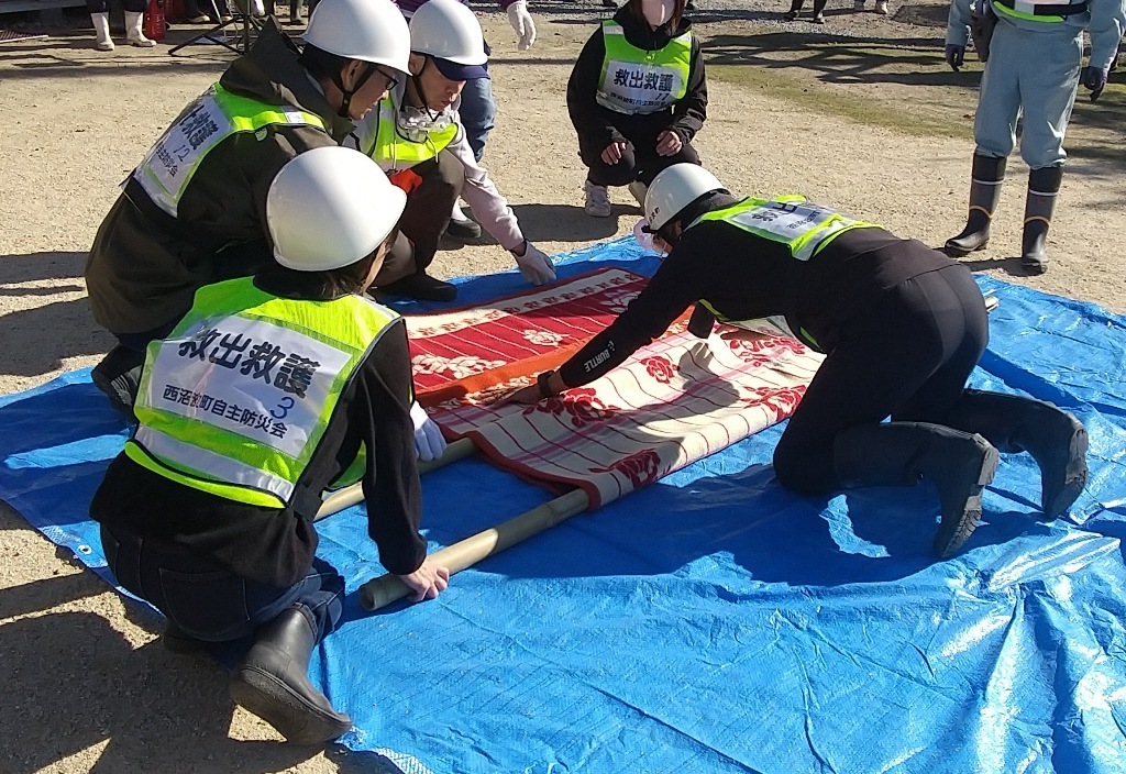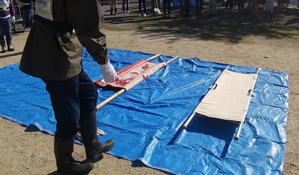 次に負傷者を運ぶための応急担架の訓練に移りました。金属と布でできた専用の担架と、竹と毛布で作った応急担架の2つを組み立てて実際に負傷者役の方を運搬しました。