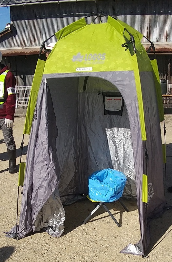 設置も簡単で外から見られないようにテントで覆うので安心して使用できます。尚二枚目の画像の便座にはもう一枚中に袋を入れて底に用を足します。